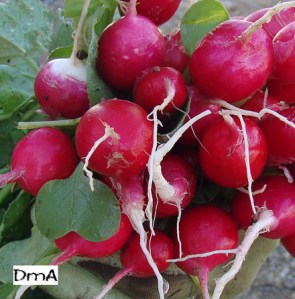 Description:  An edible taproot and a relative of the wild mustard family, dozens of radish varieties are available in white skin/pink flesh and vice visa, purple skin/white flesh, pure white, clear white, black skin/peppery white flesh, pale green skin/flesh, and red skin/white flesh. Size and shape vary from silver dollar to baseball, round or long and thin.