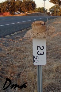 This old straw hat blends in with the dry weeds so well it’s easy to miss while driving by, unless you’re a gardener. What do you think; did the wind sweep the hat away when the owner tilted his or her head out an open car window? Did somebody toss the hat out the car window on purpose? Did the hat just happen to land on this makeshift roadside hat rack? Was it placed there—then forgotten—by one of the road crewmen while weed eating the dry fire hazard?